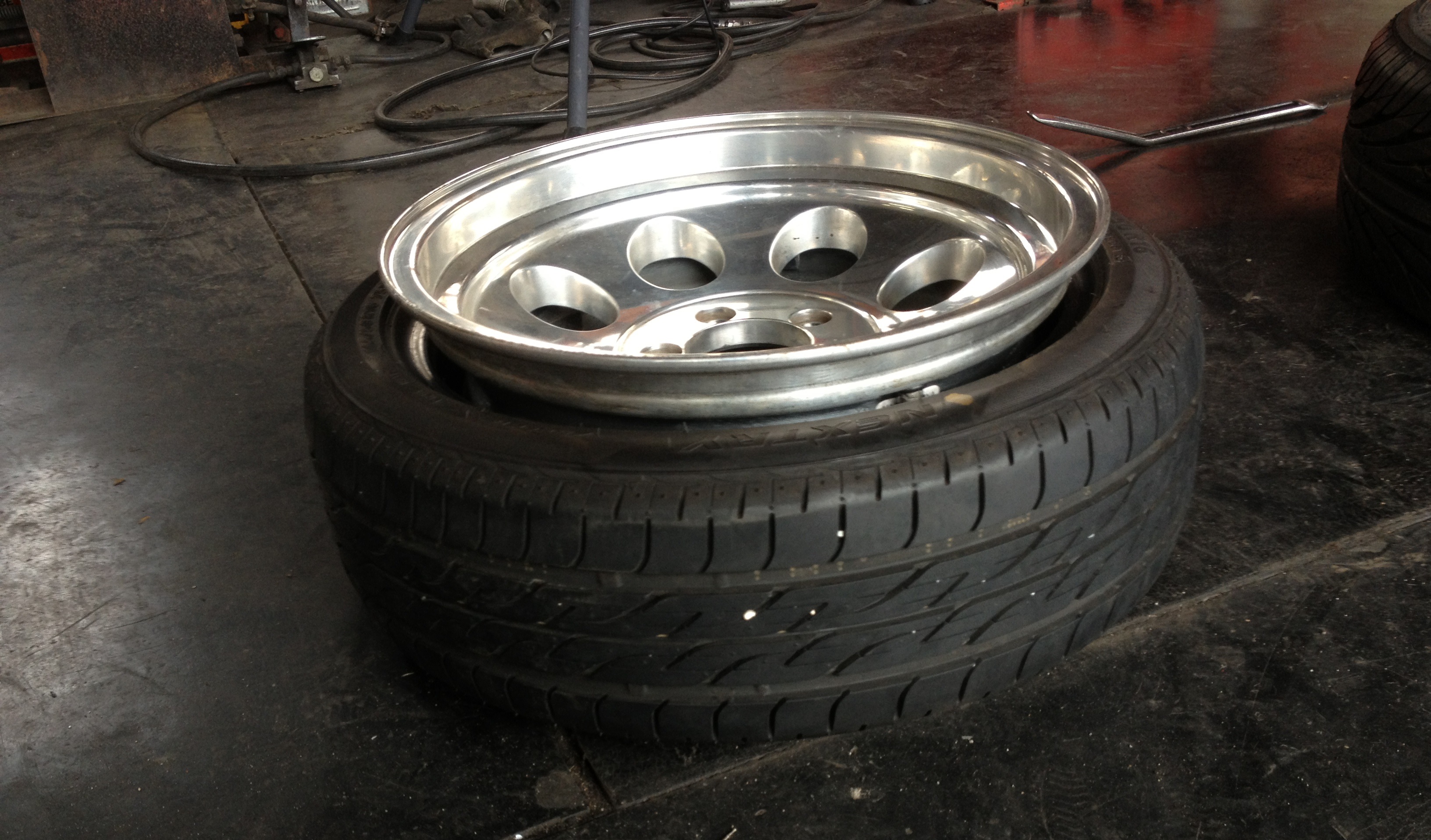 引っ張りタイヤとは、リム幅の太いホイールにリム幅の細いタイヤを履かせることにより、車高短の車のフェンダーにタイヤが当たらないようにする、手法です。