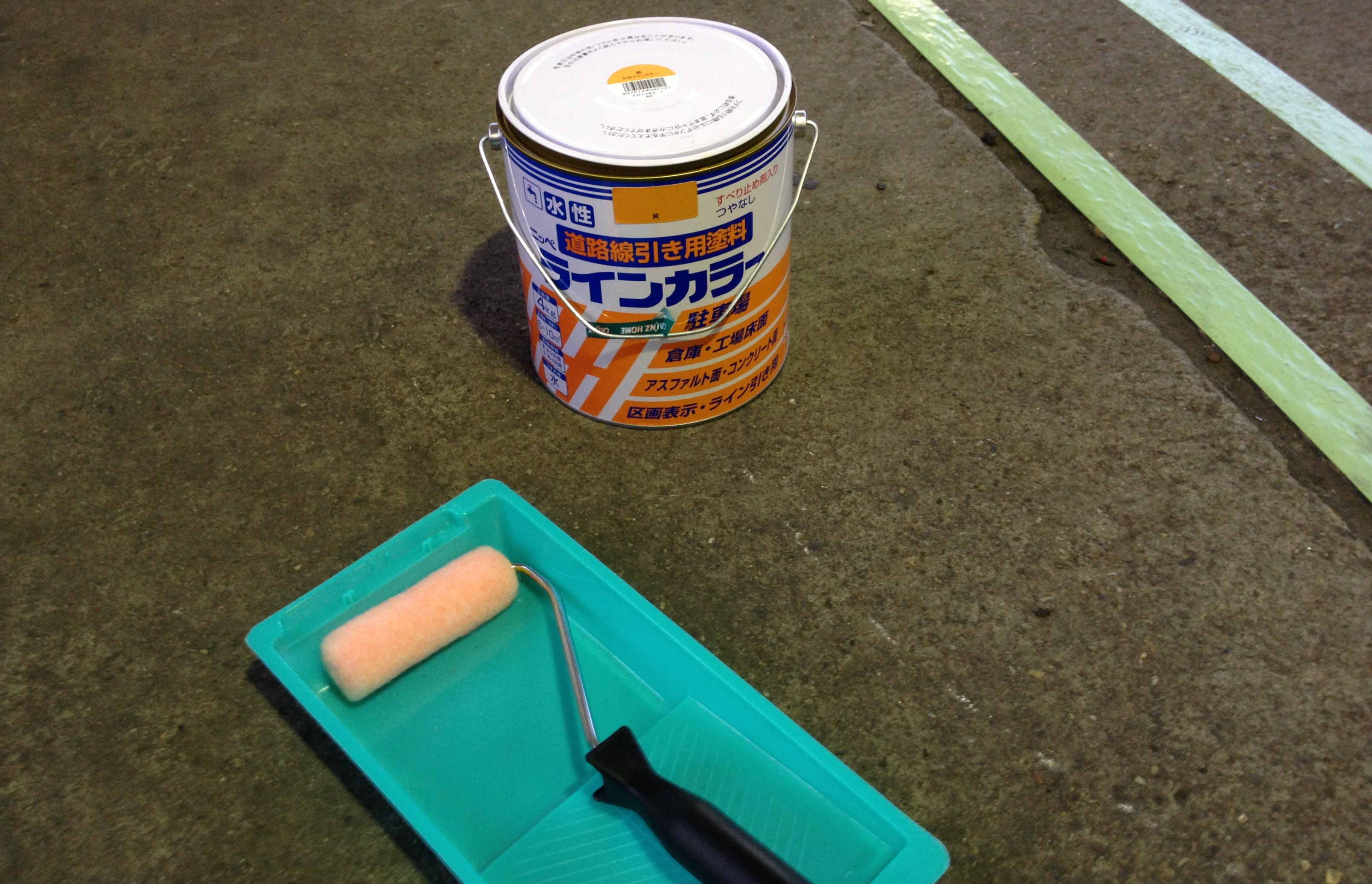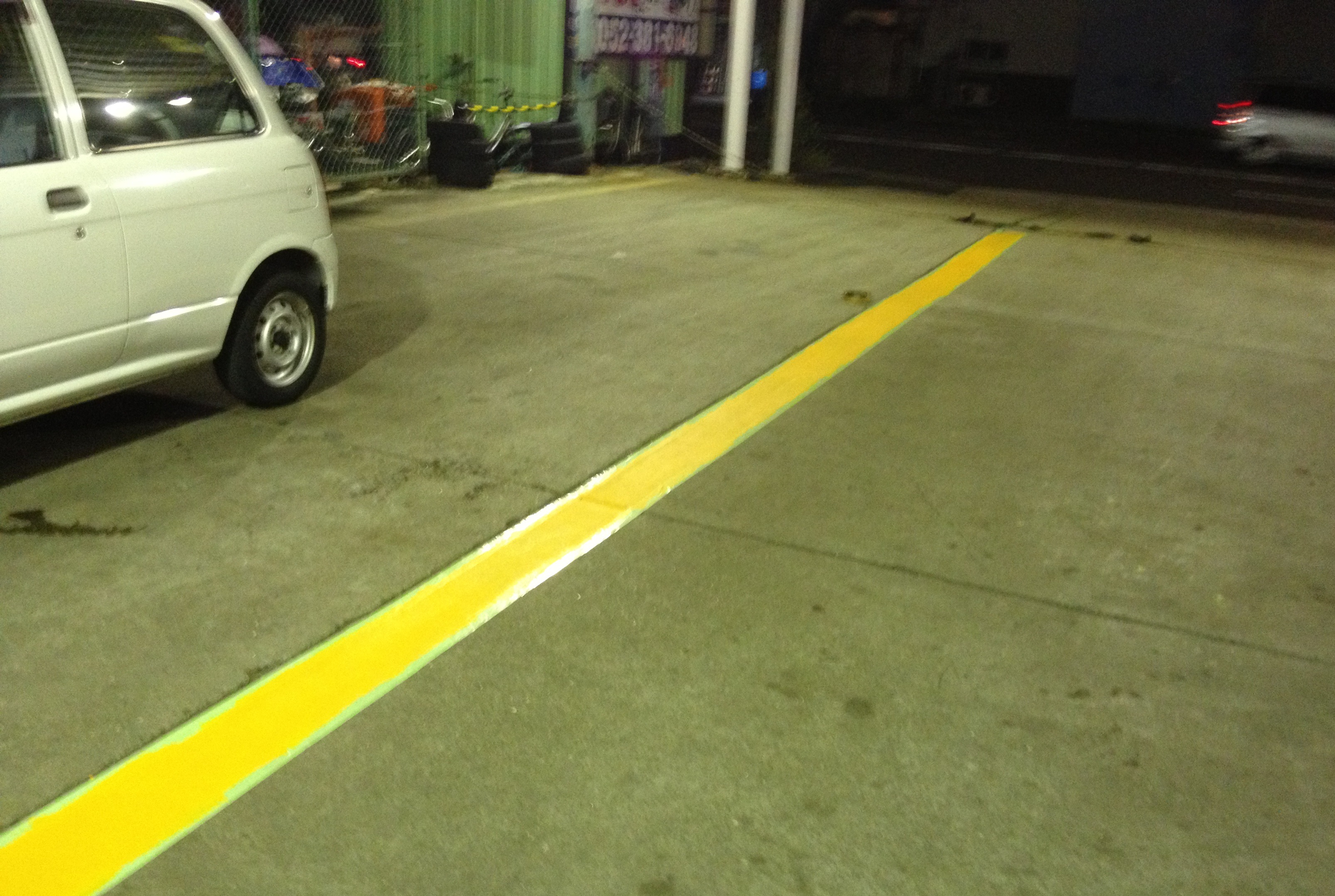 ラインの幅は大型車に合わせてあるので、乗用車のお客様は写真の車ぐらいの感覚で駐車していただけると、ありがたいです。